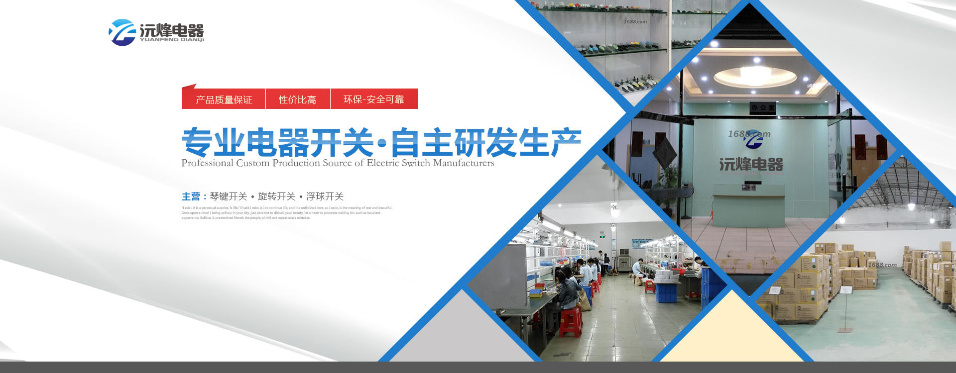 主要生產(chǎn)浮球開關(guān)、接近開關(guān)、琴鍵開關(guān)、旋轉(zhuǎn)開關(guān)、微動開關(guān)、船型開關(guān)、拉線開關(guān)以及接線座等系列產(chǎn)品。